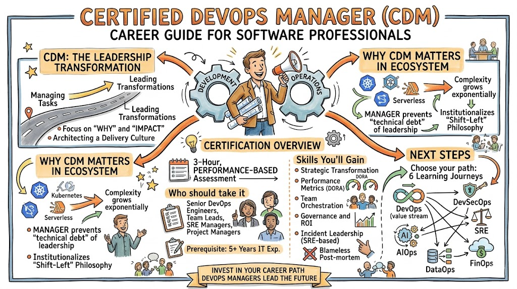 The evolution from engineer to manager is perhaps the most significant milestone in a technical career. The Certified DevOps Manager (CDM) certification is more than just a credential; it is a declaration that you have mastered the complexity of modern delivery. As we look toward a future defined by AI and autonomous systems, the need for human leaders who can navigate the ethical, financial, and technical challenges of DevOps has never been greater. By following this roadmap and committing to continuous learning, you aren’t just securing a certification—you are securing the future of your career.
