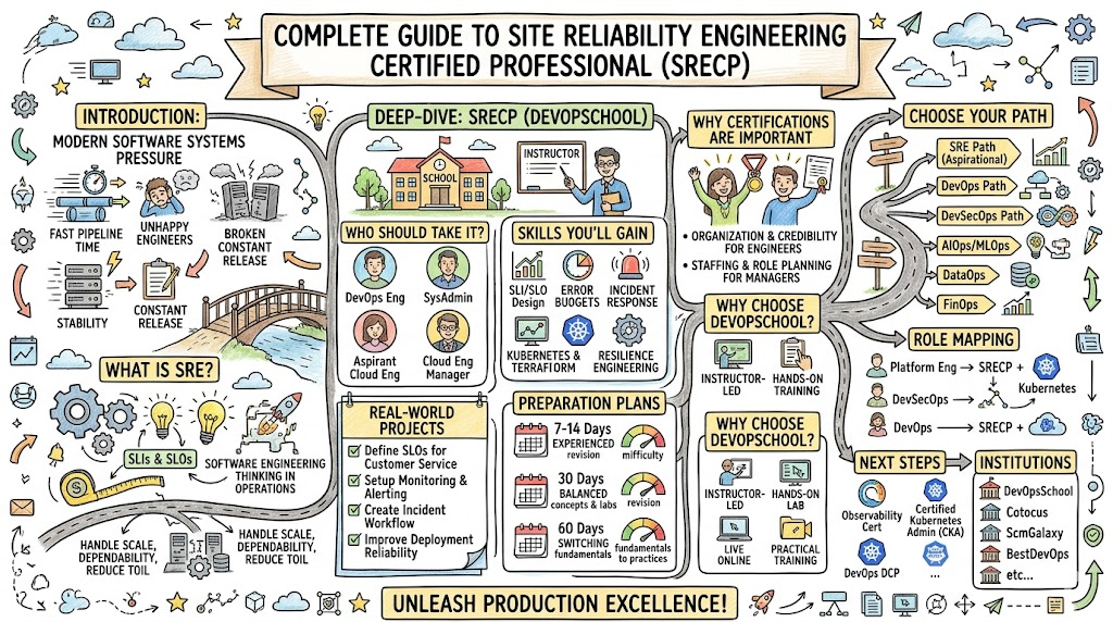 SRECP is a professional SRE certification from DevOpsSchool designed to build and validate modern reliability engineering capability. It covers core SRE ideas, service reliability measurement, operational excellence, and implementation practices for real production systems. The official page describes it as a training and certification program focused on reliability, scalability, and efficiency across the software delivery lifecycle.