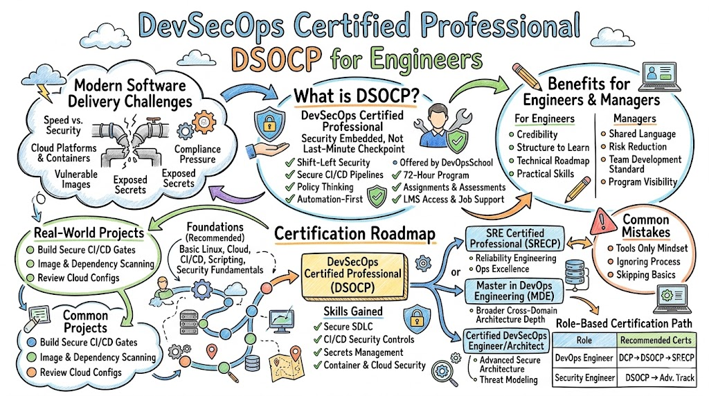 In simple terms, DSOCP is for people who want to move beyond basic DevOps and learn how to build pipelines, platforms, and release processes that are secure by design. It is not only about tools. It is about mindset, shift-left security, policy thinking, secure automation, and reducing risk without breaking delivery speed. That is why this kind of credential is useful for software engineers, DevOps engineers, cloud engineers, platform teams, and technical managers.
