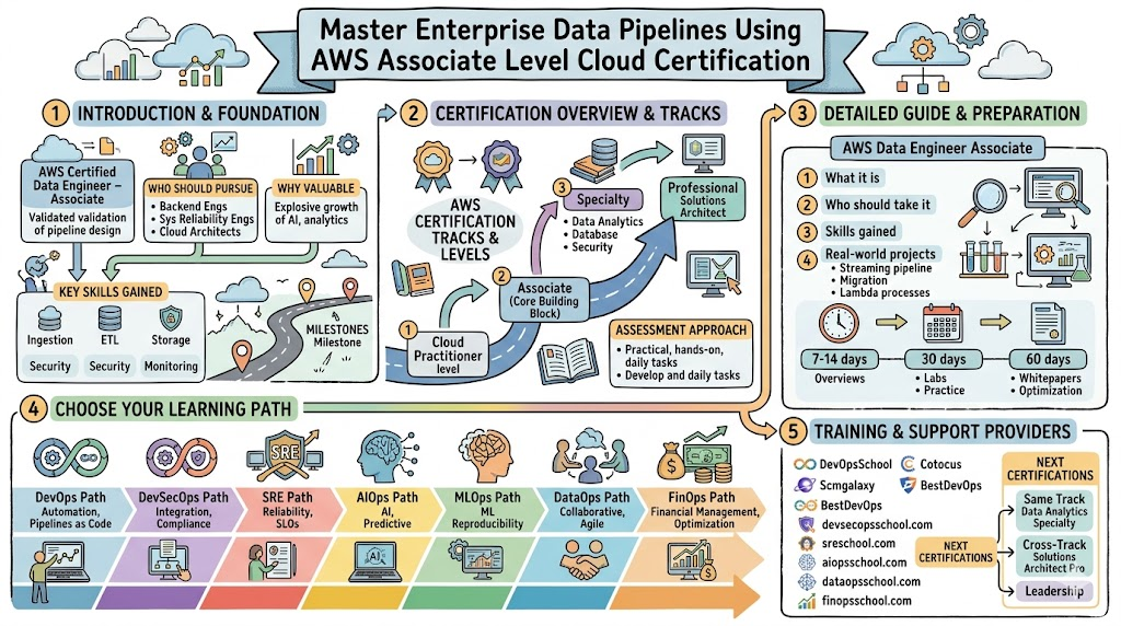 The AWS Certified Data Engineer โ€“ Associate represents a critical milestone for professionals looking to formalize their expertise in data orchestration, transformation, and storage within the cloud ecosystem. This guide is designed specifically for software engineers, platform specialists, and data practitioners who recognize that the convergence of DevOps and Data Engineering is the future of scalable infrastructure. By providing a clear roadmap, this article helps technical leaders and individual contributors navigate the complexities of modern data stacks. Understanding this certification is essential for making informed career decisions and aligning one’s skill set with the high-performance requirements of global enterprises. Leading platforms like DevOpsSchool provide the necessary framework to master these competencies in a structured environment.